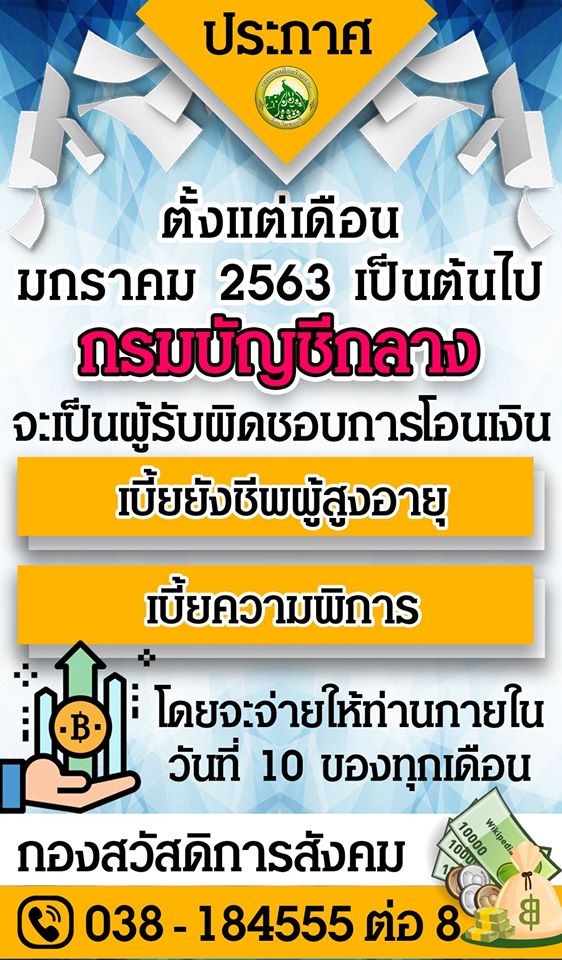 ประกาศจากเทศบาลเมืองบ้านสวน ตั้งแต่เดือนมกราคม 2563 เป็นต้นไป กรมบัญชีกลางที่เป็นผู้รับผิดชอบการโอนเงิน เบี้ยยังชีพผู้สูงอายุ และเบี้ยความพิการโดยตรง ผ่านบัญชีธนาคารตามที่ท่านได้แจ้งไว้กับเทศบาลเมืองบ้านสวน โดยจะจ่ายให้ท่านภายในวันที่ 10 ของทุกเดือน ตามที่ระเบียบกระทรวงมหาดไทยกำหนด