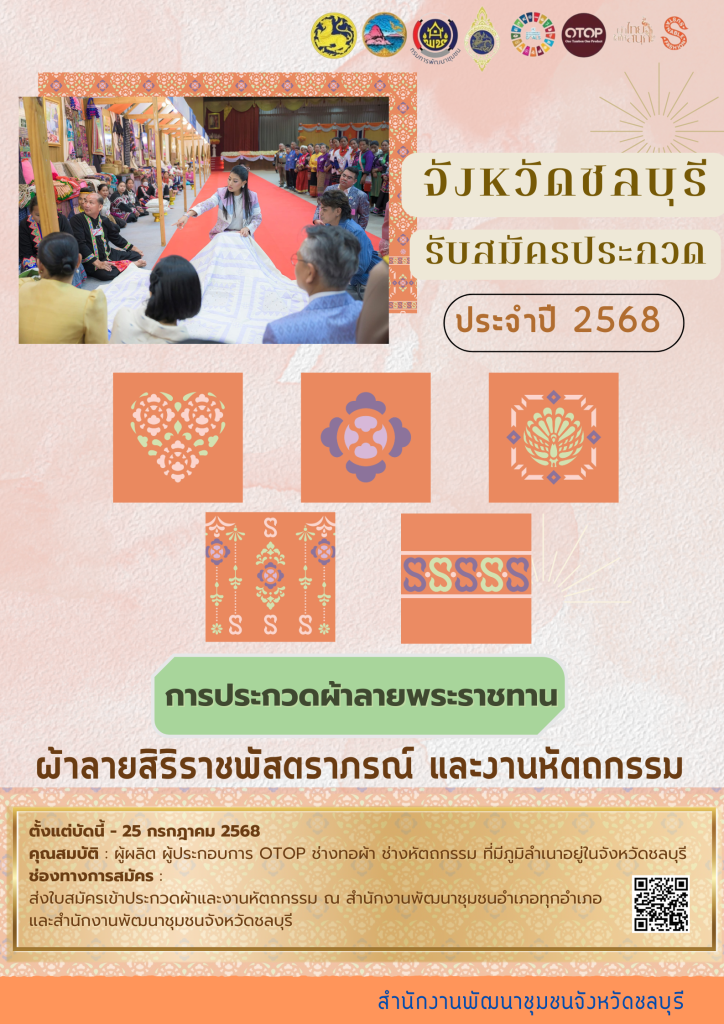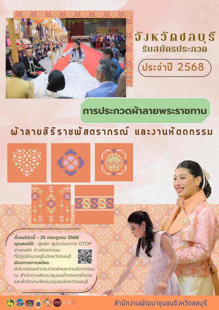 ข่าวประชาสัมพันธ์สำนักงานพัฒนาชุมชนจังหวัดชลบุรี เรื่อง การประกวดผ้าลายพระราชทาน “ผ้าลายสิริราชพัสตราภรณ์” และงานหัตถกรรม ระดับจังหวัด ประจำปี 2568
