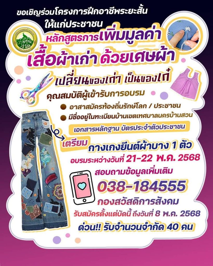 ข่าวประชาสัมพันธ์ เรื่อง โครงการฝึกอาชีพระยะสั้นให้แก่ประชาชน หลักสูตรการเพิ่มมูลค่าเสื้อผ้าเก่าด้วยเศษผ้า (Upcycling Waste to Wealth) ในวันที่ 21 – 22 พฤษภาคม 2568 เวลา 08.30 – 16.00 น. ณ ห้องประชุมยูงรำแพน ชั้น 5 สำนักงานเทศบาลนครบ้านสวน