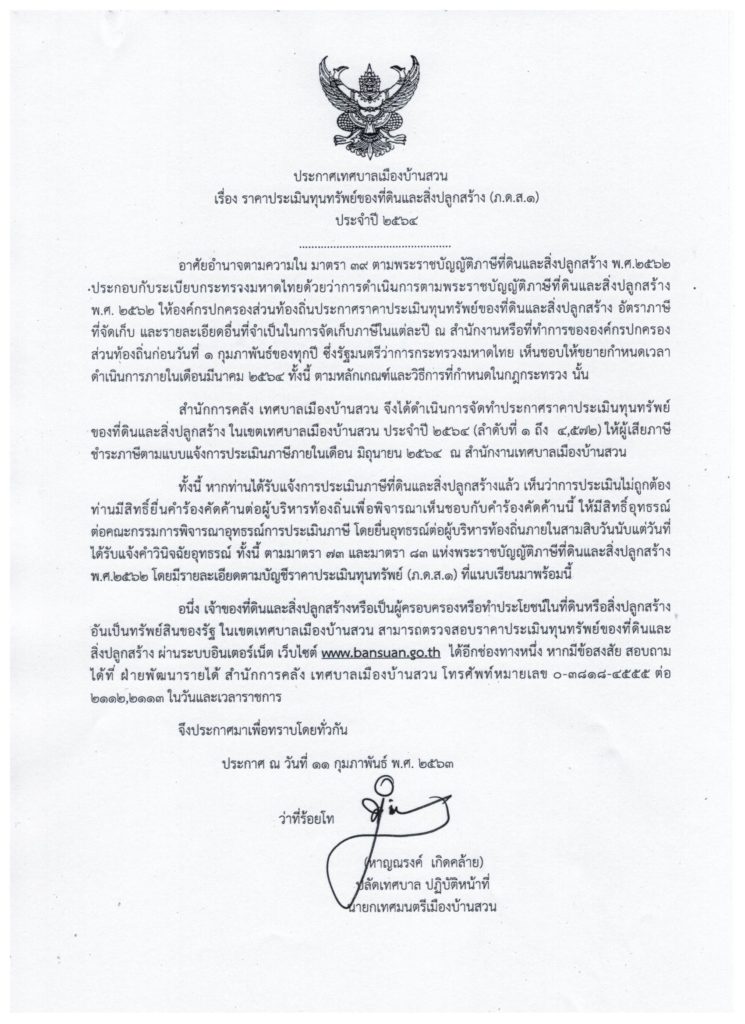 ประกาศเทศบาลเมืองบ้านสวน เรื่อง ราคาประเมินทุนทรัพย์ของที่ดินและสิ่งปลูกสร้าง(ภ.ด.ส.๑)ประจำปี ๒๕๖๔