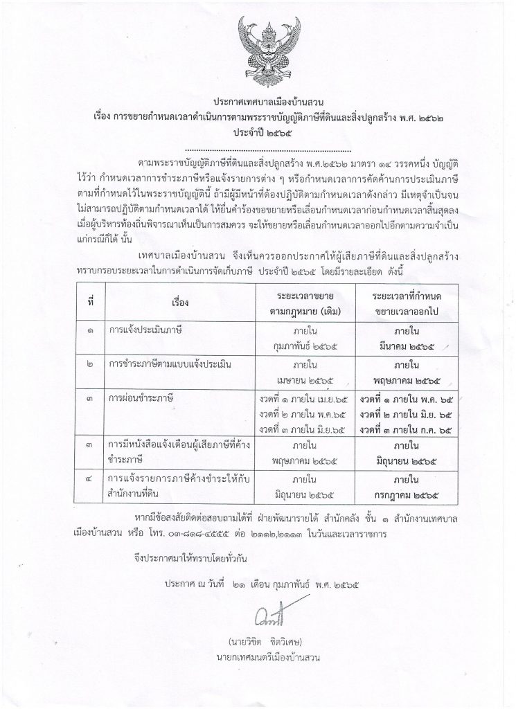 ประกาศเทศบาลเมืองบ้านสวน เรื่อง การขยายกำหนดเวลาดำเนินการตามพระราชบัญญัติภาษีที่ดินและสิ่งปลูกสร้าง พ.ศ. ๒๕๖๒ ประจำปี ๒๕๖๕