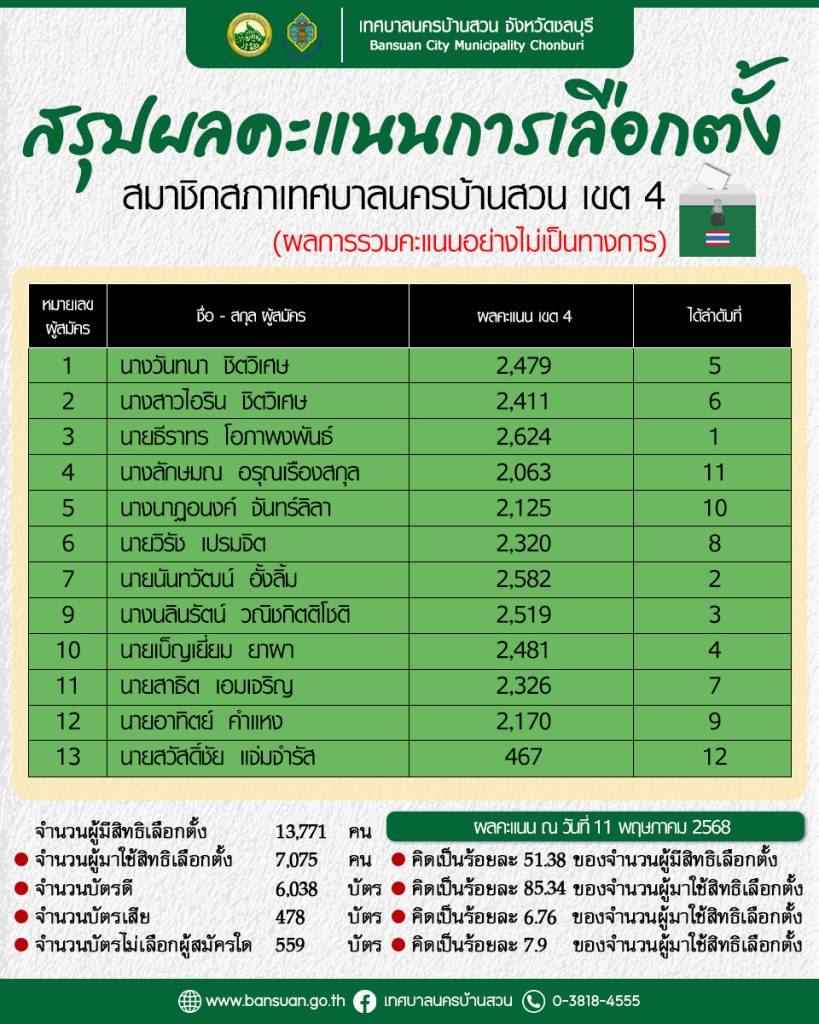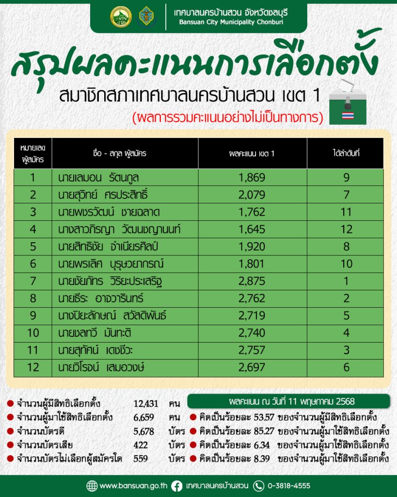 สรุปผลคะแนนการเลือกตั้งสมาชิกสภาเทศบาลนครบ้านสวน(อย่างไม่เป็นทางการ)
