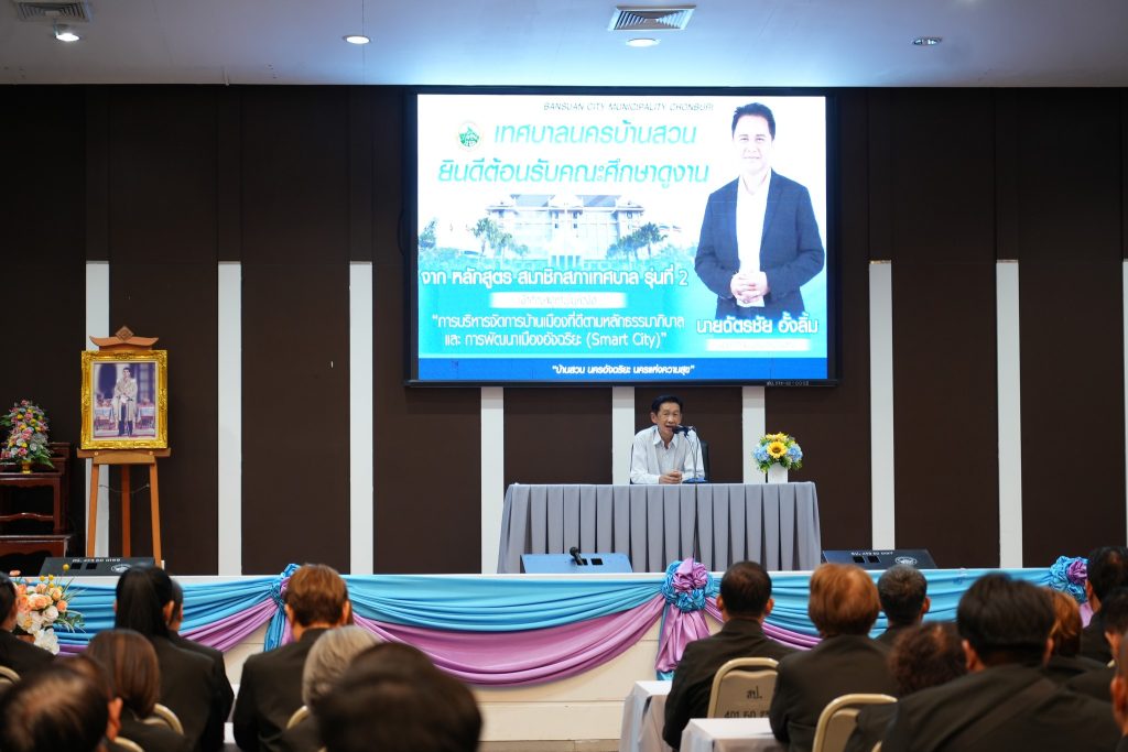 2 ตุลาคม 2568 เวลา 13.30 น. นายฉัตรชัย อั้งลิ้ม นายกเทศมนตรีนครบ้านสวน มอบหมายให้ นายมนัส เดชชีวะ รองนายกเทศมนตรีนครบ้านสวน พร้อมด้วยคณะผู้บริหาร สมาชิกสภาเทศบาล และหัวหน้าส่วนราชการ ร่วมให้การต้อนรับคณะศึกษาดูงานจาก มหาวิทยาลัยธรรมศาสตร์ หลักสูตร สมาชิกสภาเทศบาล รุ่นที่ 4 ที่มาแลกเปลี่ยนเรียนรู้และศึกษาดูงานในหัวข้อ “การบริหารจัดการบ้านเมืองที่ดีตามหลักธรรมาภิบาล และการพัฒนาเมืองอัจฉริยะ (Smart City) ณ ห้องประชุมยูงรำแพน ชั้น 5 สำนักงานเทศบาลนครบ้านสวน