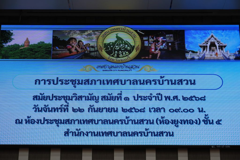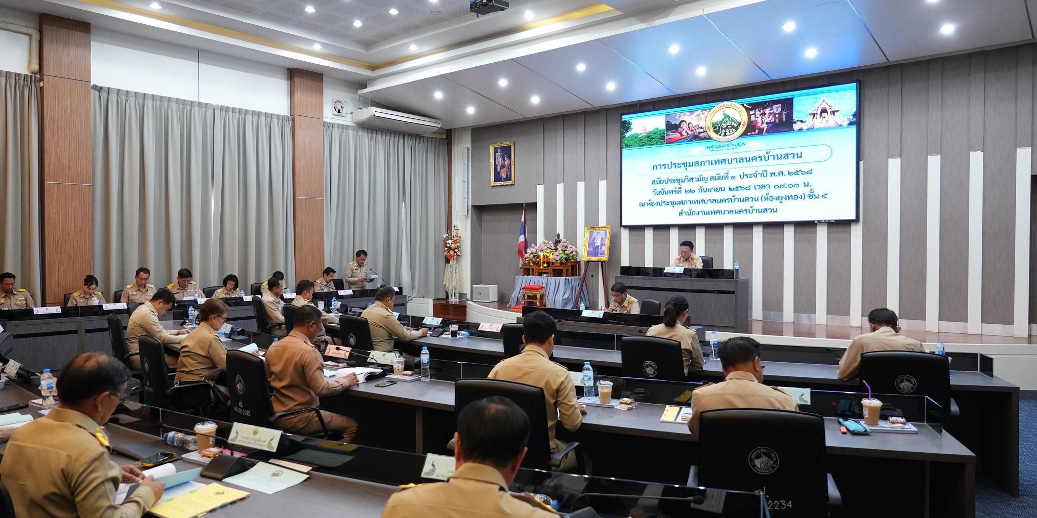 22 กันยายน 2568 เวลา 09.00 น. เทศบาลนครบ้านสวน จัดการประชุมสภาเทศบาลนครบ้านสวน สมัยวิสามัญ สมัยที่ 1 ประจำปี พ.ศ.2568 โดยมี นายฉัตรชัย อั้งลิ้ม นายกเทศมนตรีนครบ้านสวน พร้อมด้วยคณะผู้บริหาร สมาชิกสภาเทศบาลฯ ปลัดเทศบาลฯ รองปลัดเทศบาลฯ หัวหน้าส่วนราชการ และเจ้าหน้าที่ที่เกี่ยวข้องเข้าร่วมการประชุมฯ ณ ห้องประชุมยูงทอง ชั้น 5 สำนักงานเทศบาลนครบ้านสวน