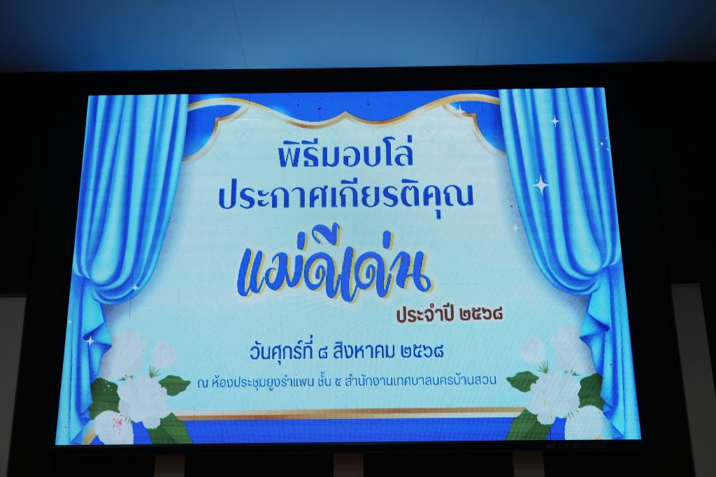 และพิธีมอบโล่ประกาศเกียรติคุณ โครงการเชิดชูเกียรติแม่ดีเด่น ประจำปี 2568 ให้แก่ แม่ผู้มีความมานะอดทนขยันหมั่นเพียร , แม่ผู้ทำประโยชน์ต่อผู้อื่นและสังคม ซึ่งมีวัตถุประสงค์เพื่อสำนึกในพระมหากรุณาธิคุณของสมเด็จพระนางเจ้าสิริกิติ์ พระบรมราชินีนาถ พระบรมราชชนนีพันปีหลวง เพื่อให้ผู้เป็นแม่ได้ตระหนักถึงหน้าที่ของตนที่พึงมีต่อบุตร ธิดา และครอบครัว เพื่อส่งเสริมให้ประชาชนในเขตเทศบาลนครบ้านสวน ได้ตระหนักถึงความสำคัญของวันแม่แห่งชาติ รวมทั้งเป็นการรักษาประเพณีและวัฒนธรรมอันดีงามของชาติไทยให้คงอยู่ต่อไป ณ ห้องประชุมยูงรำแพน ชั้น 5 สำนักงานเทศบาลนครบ้านสวน