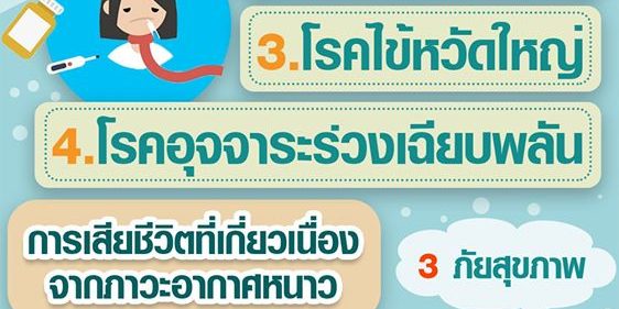 ? 3 ภัยสุขภาพได้แก่ การเสียชีวิตที่เกี่ยวเนื่องจากภาวะอากาศนาว , การสูดดมก๊าซพิษและขาดอากาศหายใจจากเครื่องทำน้ำอุ่นระบบก๊าซ , การเกิดอุบัติเหตุทางถนนในช่วงอากาศหนาวและหมอกจัด
