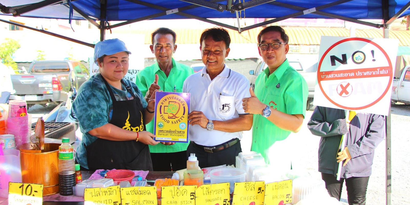 28 ส.ค.62 เวลา 16.30 น. นายชัยเดช ชิตวิเศษ รองนายกเทศมนตรีเมืองบ้านสวน พร้อมด้วยสมาชิกสภาเทศบาล และงานคุ้มครองผู้บริโภคและสุขาภิบาลอาหาร กองสาธารณสุขและสิ่งแวดล้อม ลงพื้นที่ดำเนินการมอบป้าย อาหารปลอดภัย ตามโครงการเฝ้าระวังความปลอดภัย ด้านอาหาร ประจำปีงบประมาณ 2562 โดยมอบให้แผงค้าที่ผ่านการตรวจสอบสารปนเปื้อน 2 ครั้ง และเดินรณรงค์ประชาสัมพันธ์โครงการลดเสี่ยงเลี่ยงการใช้โฟมบรรจุอาหาร บริเวณตลาดนัดตึกน้ำ