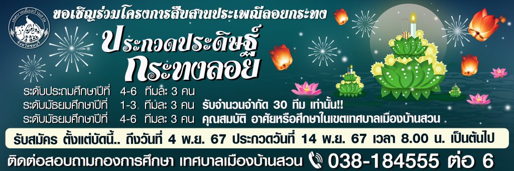 โครงการสืบสานประเพณีลอยกระทง ประจำปีงบประมาณ พ.ศ. 2568 สมัครเข้าร่วมประกวดประดิษฐ์กระทงลอย [คลิก] https://sites.google.com/view/education-bansuan หลักเกณฑ์การประกวดกระทงลอยดาวน์โหลด