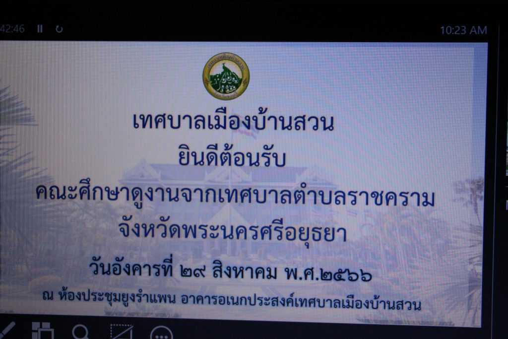9 ส.ค.66 เวลา 10.30 น. นายวิชิต ชิตวิเศษ นายกเทศมนตรีเมืองบ้านสวน พร้อมด้วยคณะผู้บริหาร สมาชิกสภาเทศบาล และหัวหน้าส่วนราชการ ร่วมให้การต้อนรับคณะศึกษาดูงานจากเทศบาลตำบลราชคราม จังหวัดพระนครศรีอยุธยา ที่เข้าศึกษาดูงานแลกเปลี่ยนเรียนรู้ในด้าน “การบริหารโรงเรียนผู้สูงอายุ” ณ ห้องประชุมยูงรำแพน ชั้น 5 อาคารอเนกประสงค์เทศบาลเมืองบ้านสวน